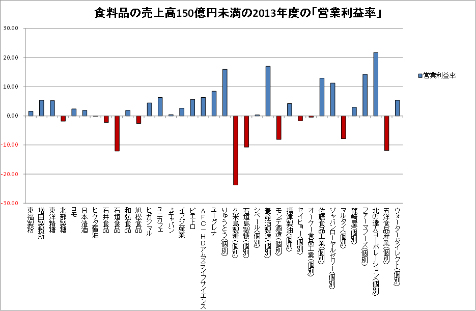 xbrl食料品の売上高150億円未満の「売上原価・販管費・営業利益」の三色三角バブルグラフ。