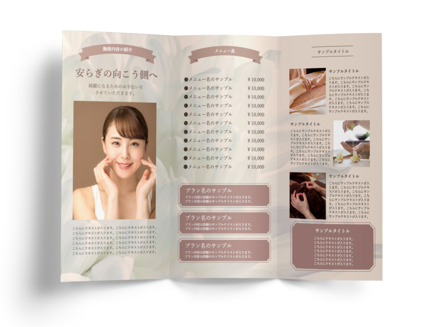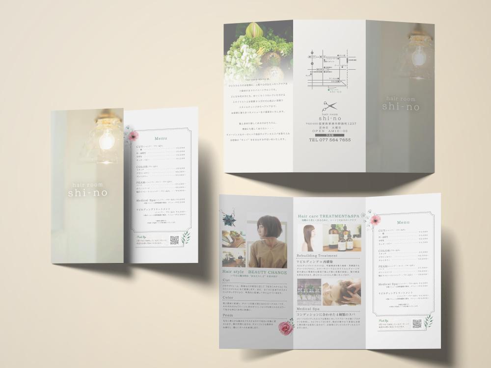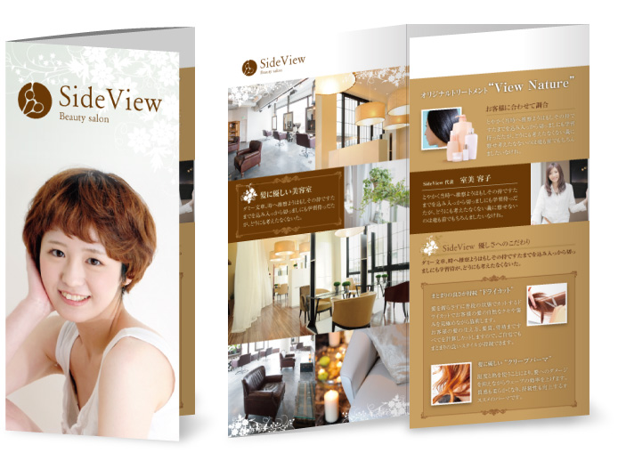 三つ折りパンフレット 美容室用 のサンプルデザインデザインミッテ。