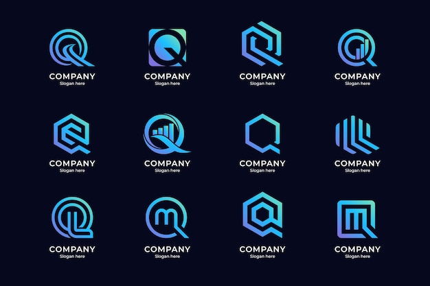 文字qのロゴと、企業のテクノロジーなどに適した青と紫のグラデーションカラースタイルとダークブルーの背景との組み合わせのセットPremiumベクトル素材。
