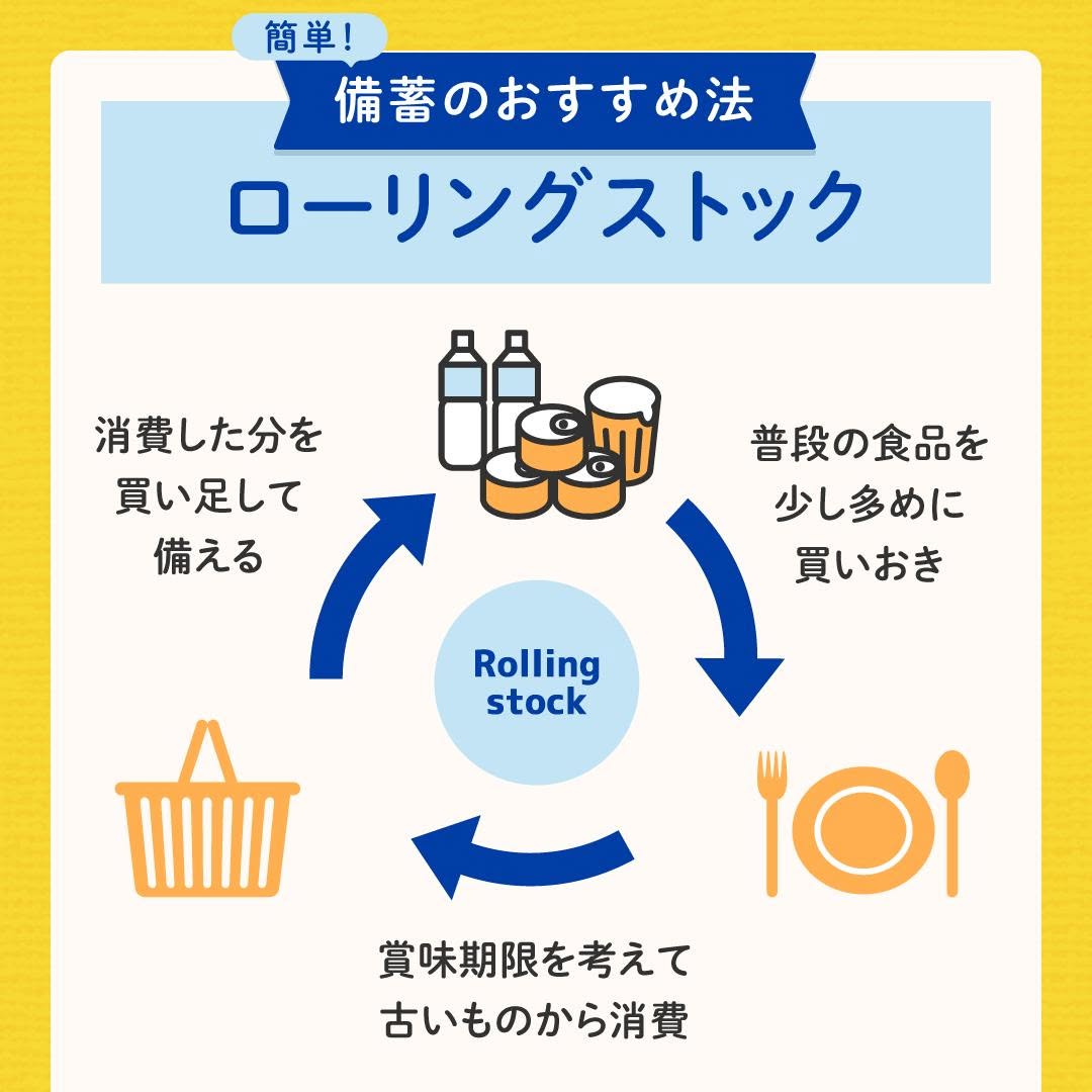 食料や日用品を備蓄するのが大変? そんなあなたにローリングストック \ ローリングストックとは、日常備蓄のことで、備蓄品を定期的に消費し、消費した分を買い足す方法です。普段から多めに買って、古いものから使うだけでOK! 気軽にローリングストックを始めてみま。