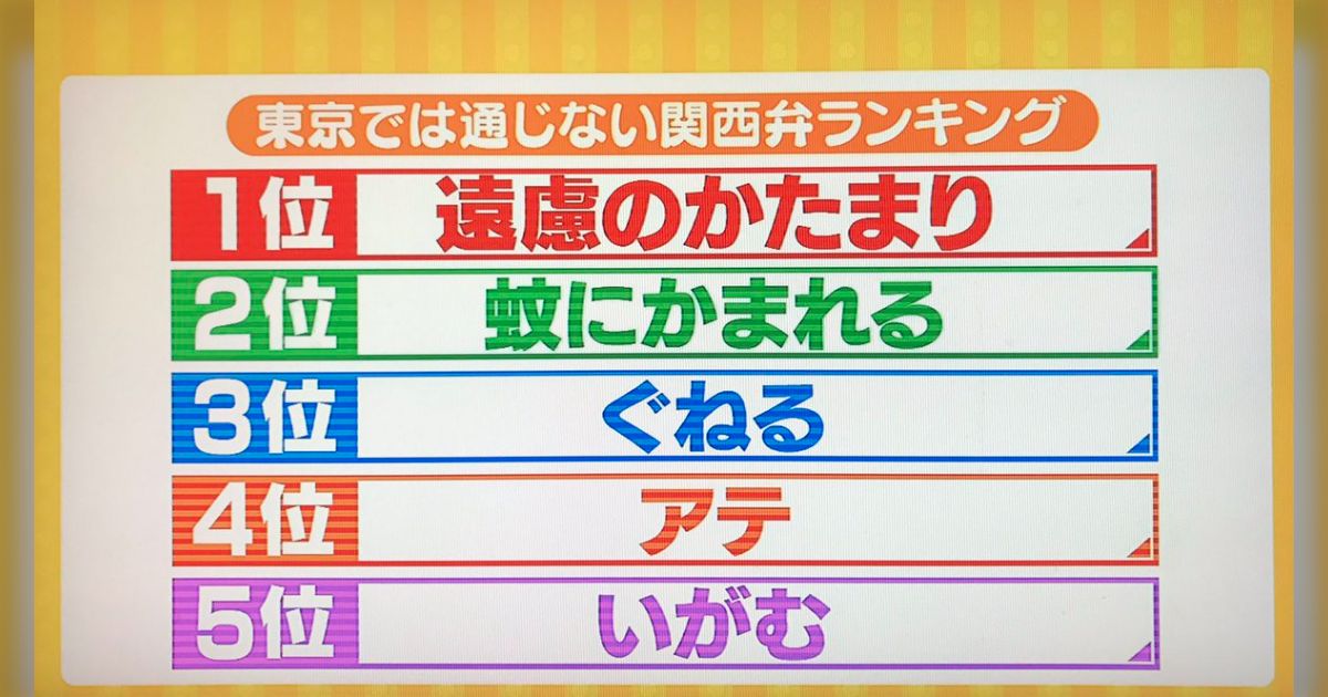 遠慮のかたまり」「いがむ」 「東京では通じない関西弁ランキング」の新バージョンに関西人は驚くちゃちゃ入れマンデー - Togetter。