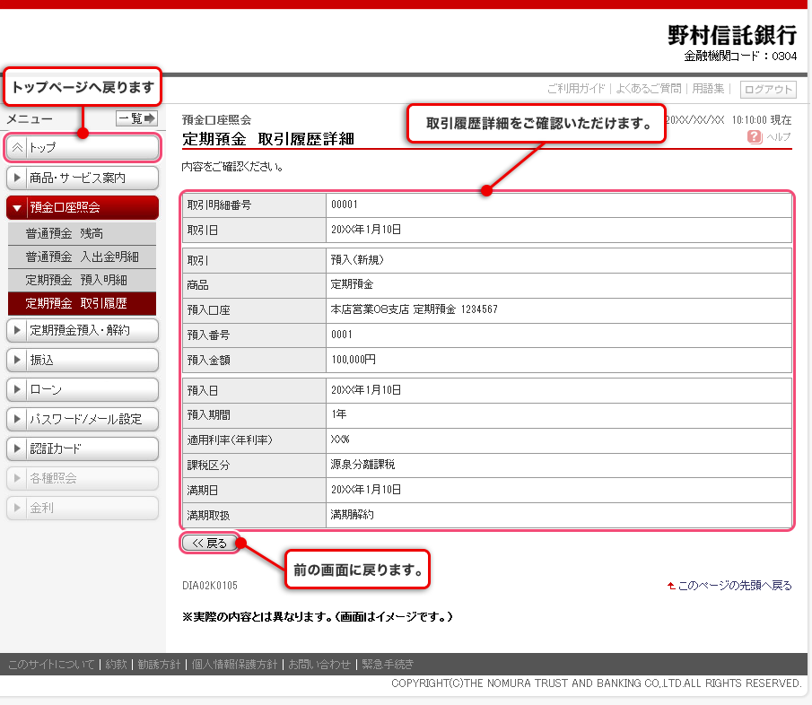 体験デモ 定期預金 取引履歴詳細インターネットバンキング野村信託銀行。