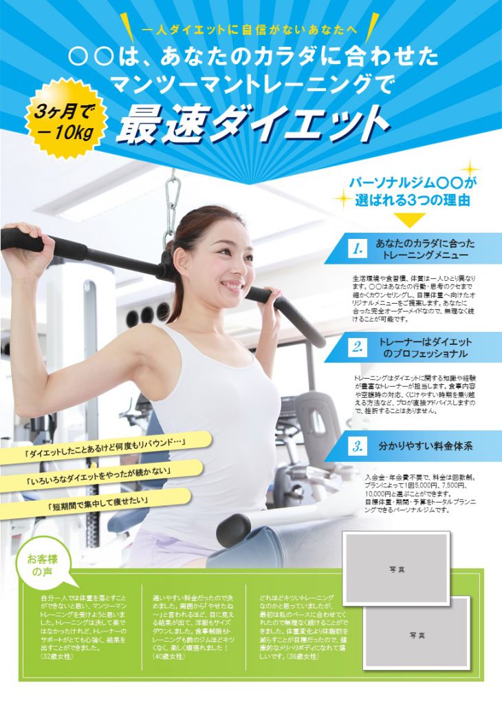 出張パーソナルトレーニングチラシデザイン事例料金紹介、生徒募集チラシ作成専門 デザイン+印刷のCHIRASAKU チラサク。