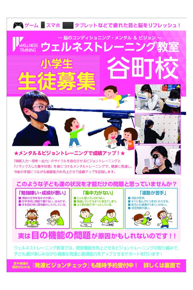 目トレクラブ、初チラシ! スポーツ、勉強、頑張っているのに、 なかなか成果が出ないもしかすると、 見る力が原因かもしれません。学校生活、習いごと、コミニュケーション、 全ての土台作りの教室! 目を動かす、 身体を動かす、 脳を動かす、 トレーニング! 将来。