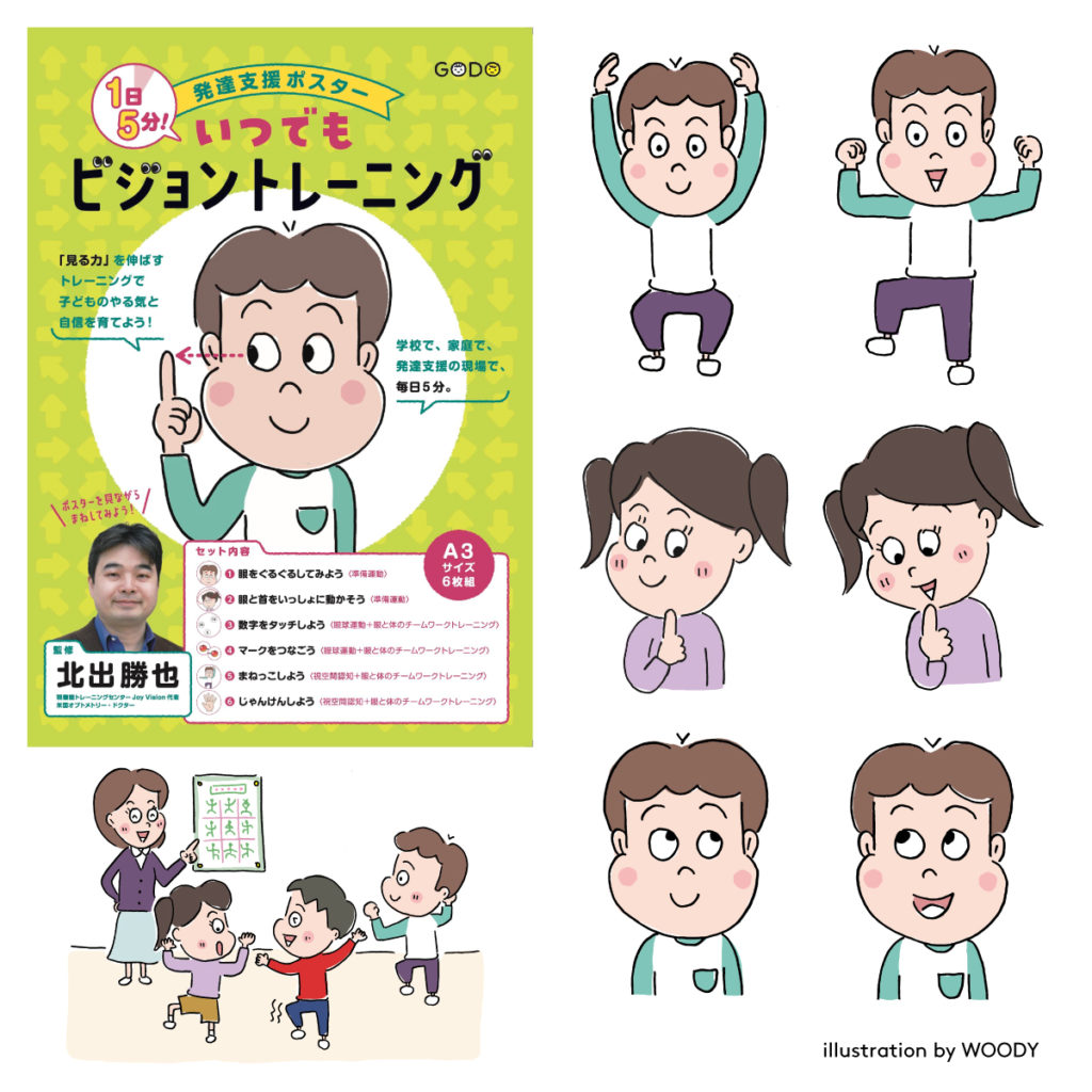 ポスター 「発達支援ポスター 1日5分! いつでもビジョントレーニング」 合同出版装画ポスター挿絵イラストレーターwoody ウッディ のウェブサイト。
