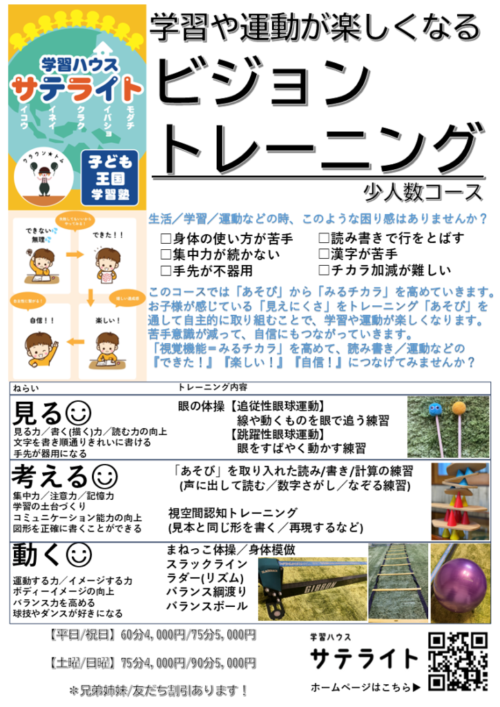 個別学習塾 ビジョントレーニング教室 個別フリースクールのご案内です! – 学習ハウス サテライト。