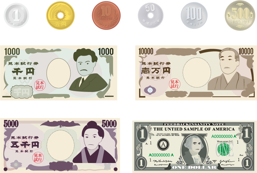 フリーイラスト日本の紙幣と硬貨のお金のセットと1ドル札でアハ体験GAHAG著作権フリー写真・イラスト素材集 - GAHAG著作権 フリー写真・イラスト素材集。