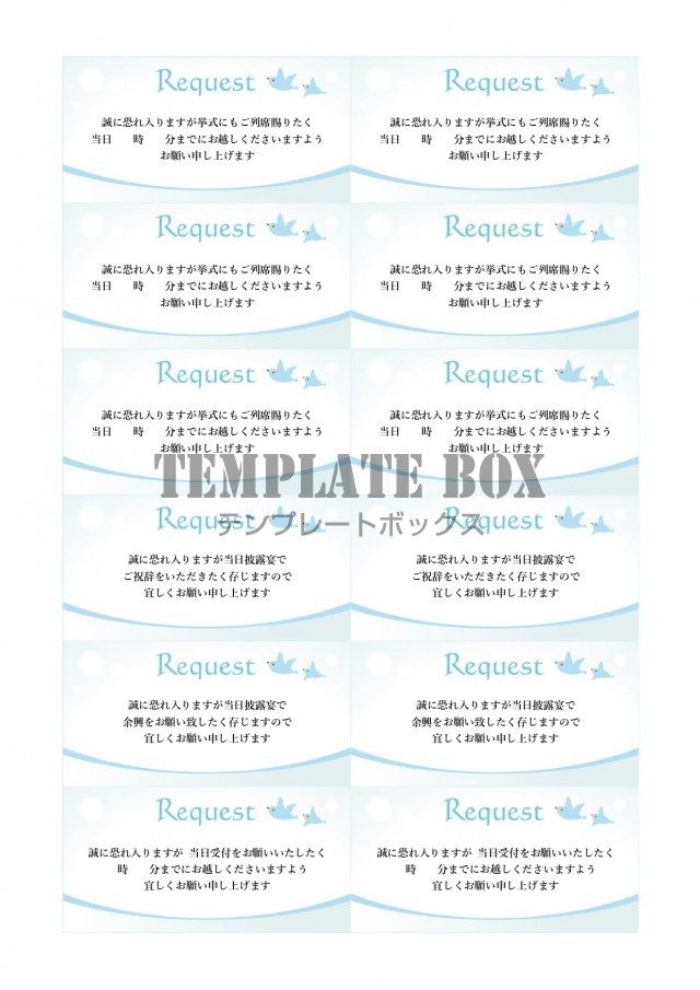 結婚式招待状の付箋 水色を基調にかわいい鳥が飛んでいるイラストが入った、爽やかなデザインのテンプレート!~サムシングブルー~無料テンプレート TemplateBox。
