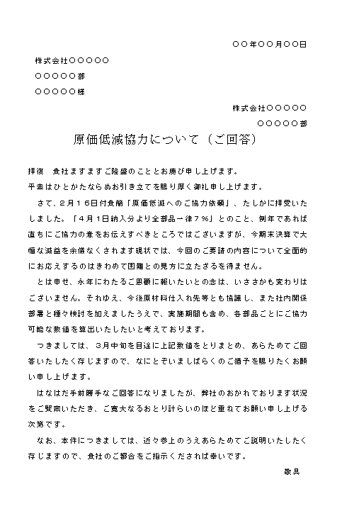 ビジネスメール 値引き断りビジネス書式テンプレート 経費削減実行委員会。