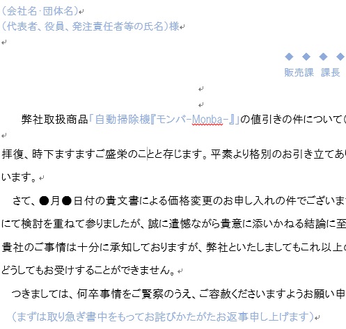 断り状③お断り文、回答書、値引き、価格変更、社外文書ビジネス文書クリップ。