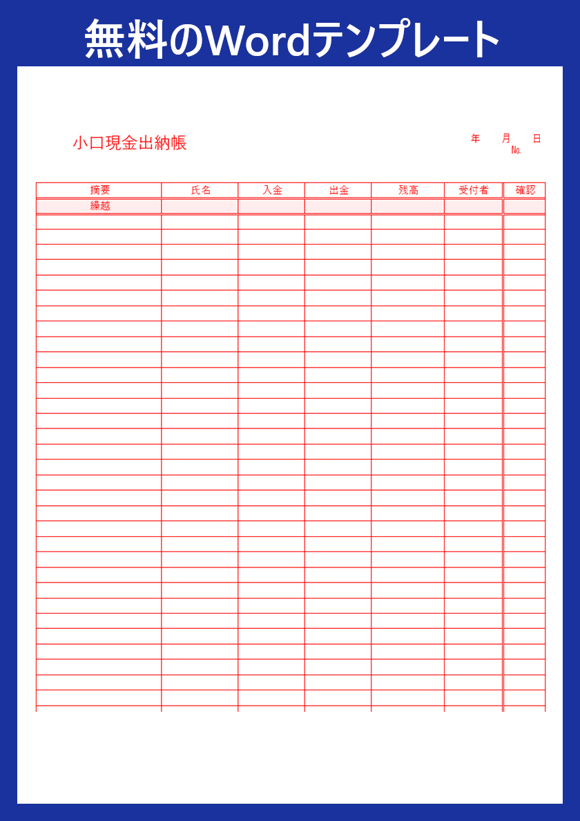 小口現金出納帳テンプレート08 Word・ワード使いやすい無料の書式雛形テンプレート。