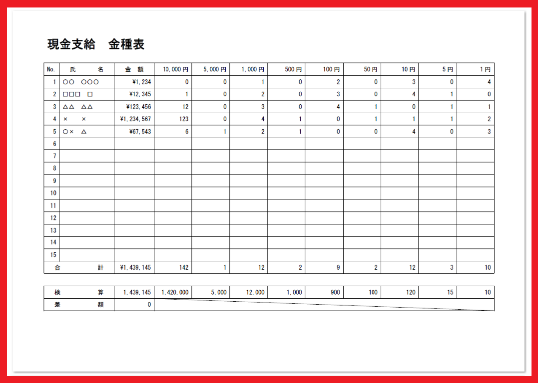 現金支給金種表のエクセルで簡単に合計!無料で使えるテンプレート素材💗無料ダウンロード「かわいい」雛形・テンプレート素材。