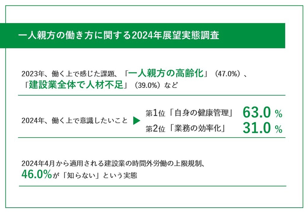 2023年の働き方 課題は「一人親方の高齢化」が最多 2024年に向け、63.0%が意識するのは- BuildApp News。