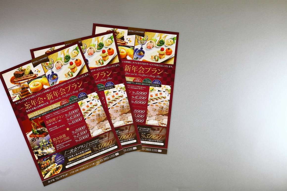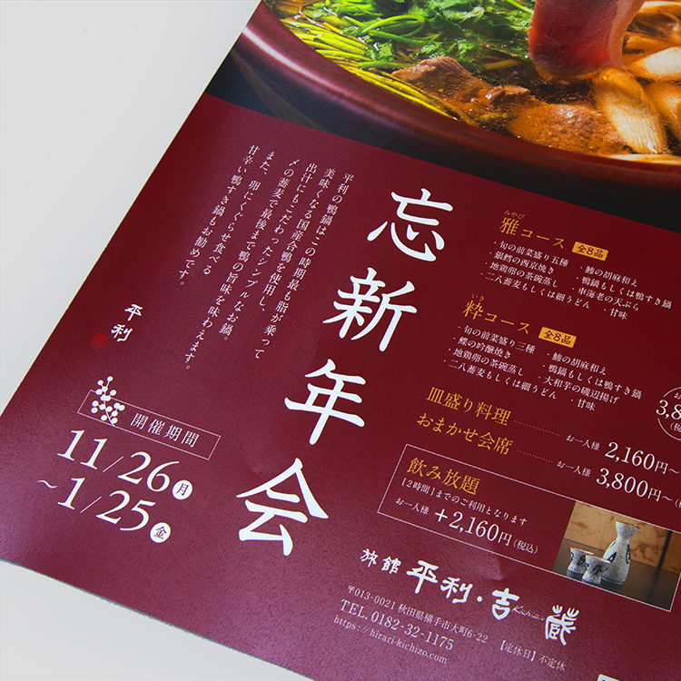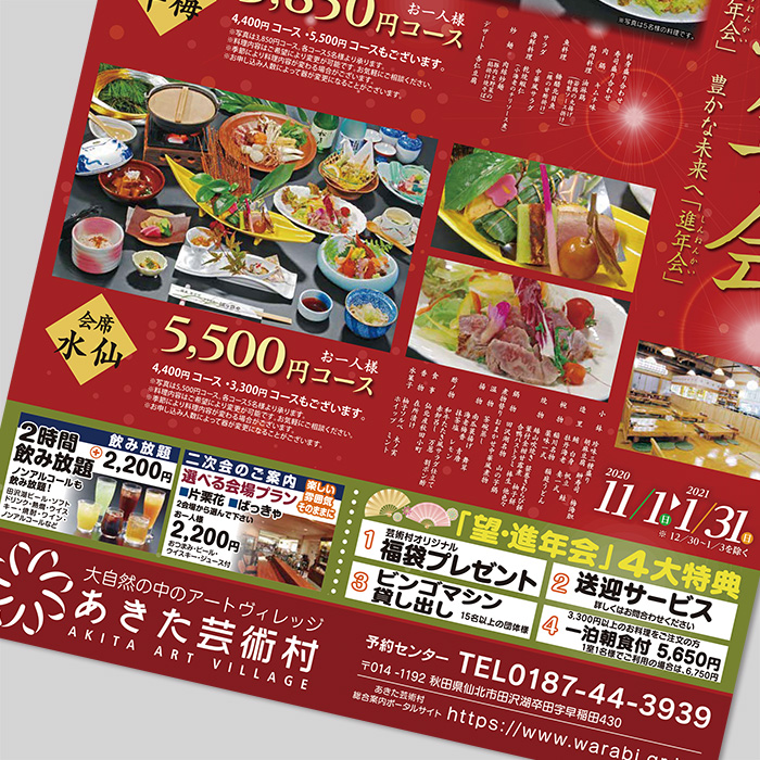 忘年会・新年会案内チラシ秋田パンフレット制作.com。