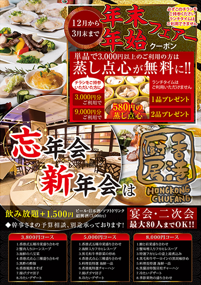 忘年会・新年会など宴会メニュー豊富な広東料理店のチラシアリキヌ:チラシ制作部。