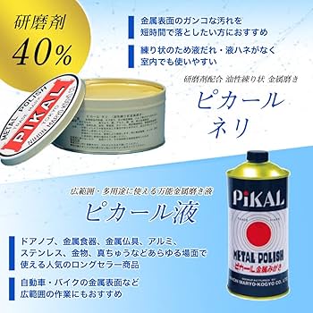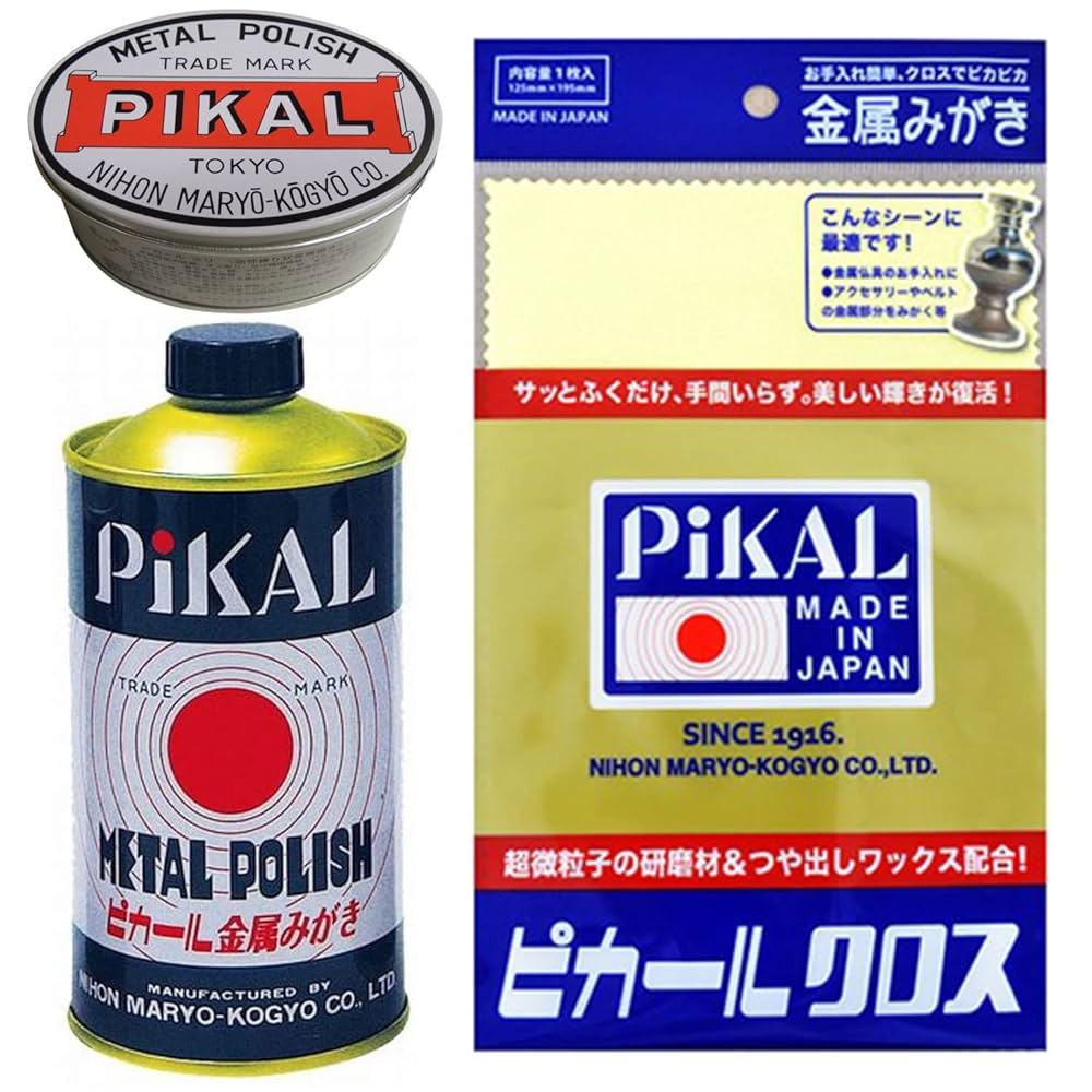 研磨剤・金属磨き3点セット ピカール液 500g + ピカールネリ 250g + 専用クロスセット1枚 バイク や腕時計、アクセサリーそして台所などの水回りのサビ取りや黄ばみ取りにも最適。創業100年以上、信頼と実績の日本磨料工業 安心の定番セット - メルカリ。