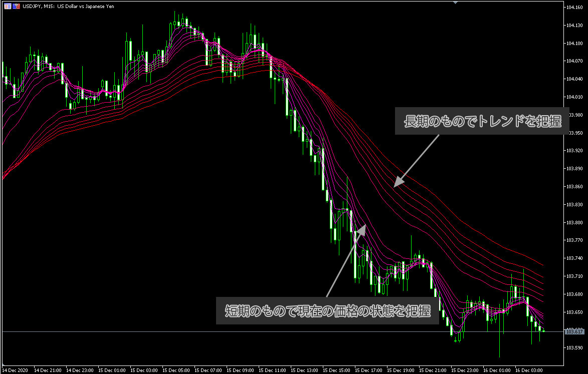 初心者向けFX手法 GMMAとは 複合型移動平均線 EMA12本の設定や使い方を解説。