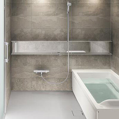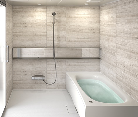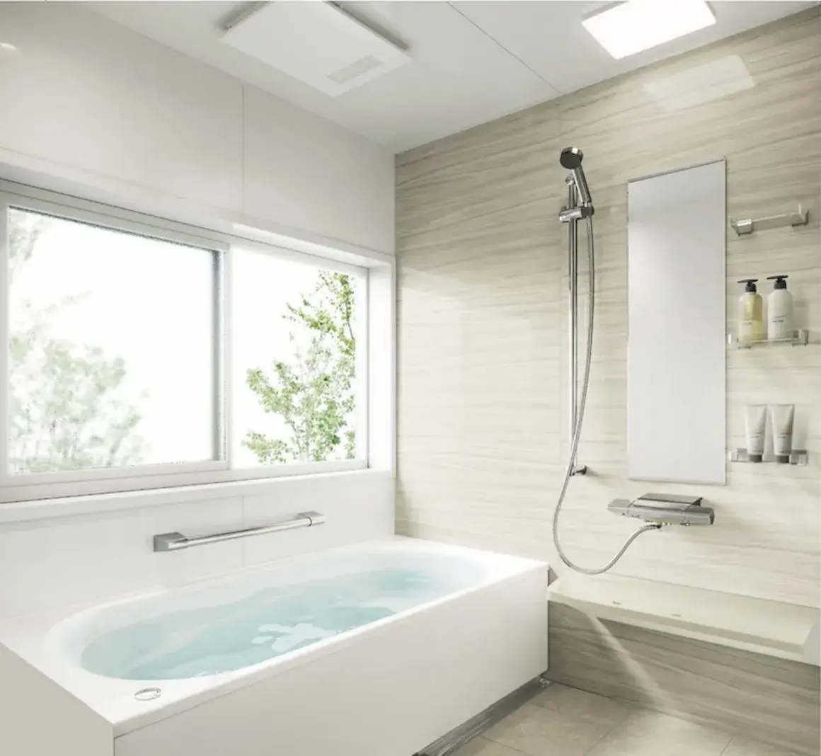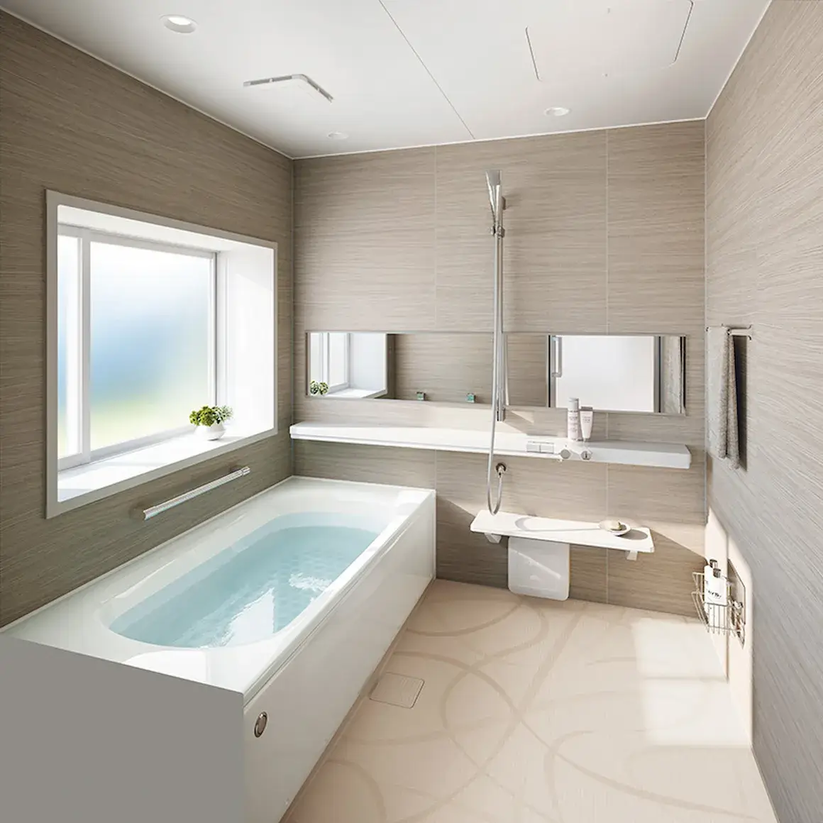 お手入れ簡単ちょっと人とは違うバスルームにしたい くつろぎ感にもこだわりたいという方におすすめの、 ミラタップのシステムバスノウム 。横長のミラーが空間を広く見せ、 ゆっくりとくつろげる空間を作ります。 詳しくは、商品ページをご覧ください。