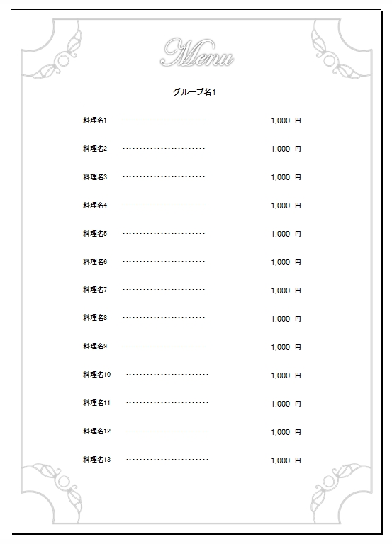 メニュー表のカテゴリ一覧無料のビジネス書式テンプレート。