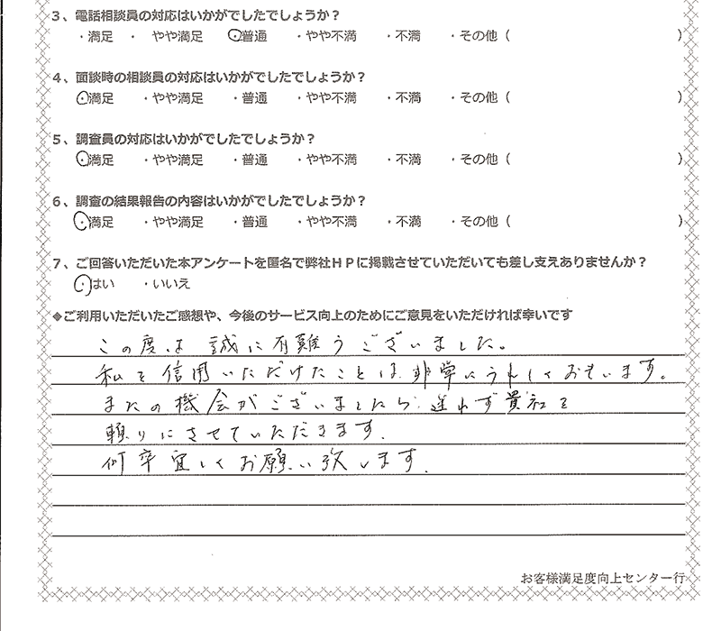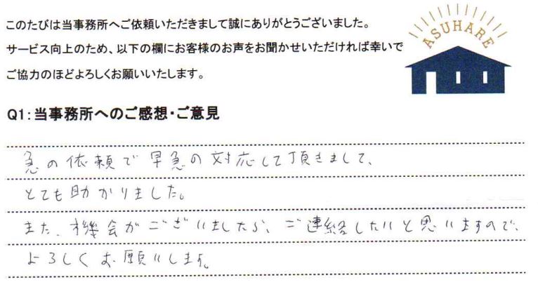 お客様の声 No.268横浜の相談実績4,000件超ソワレ行政書士法人・ソワレ司法書士法人初回相談無料。