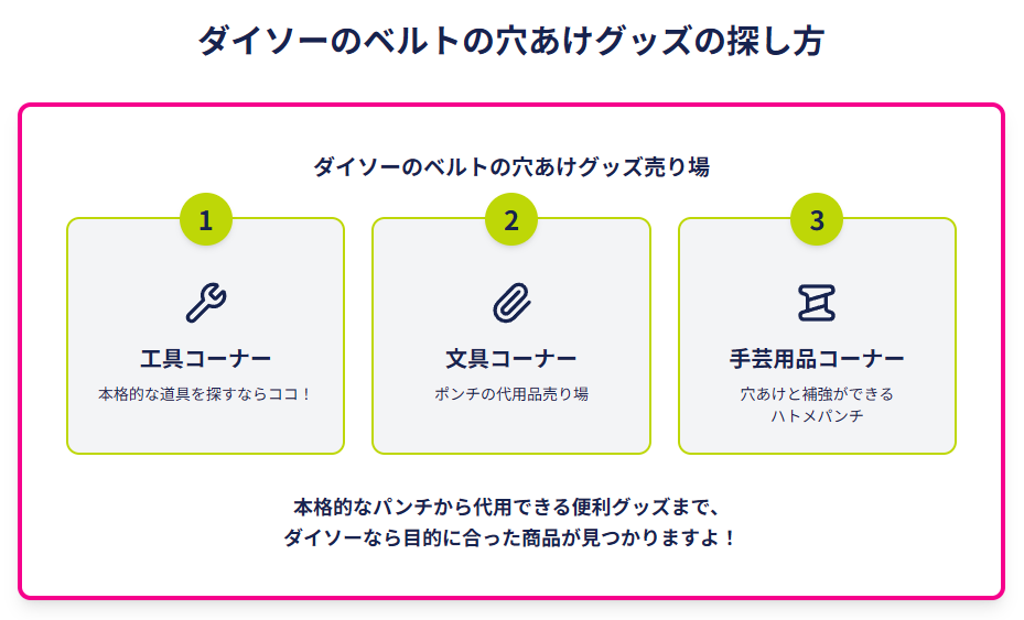 ベルト穴開けのダイソーの売り場はどこ?ハトメパンチは売ってない。
