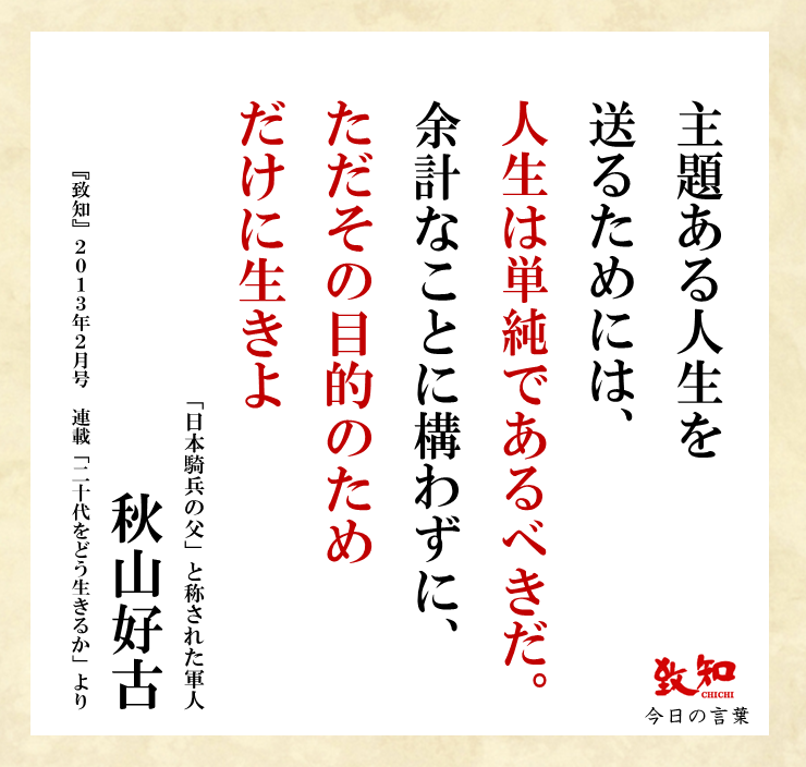 致知出版社 公式on X: "11 3🌤今日の名言 主題ある人生を送るためには、人生は単純であるべきだ。余計なことに構わずに、ただその目的のためだけに生きよ ――秋山好古 「日本騎兵の父」と称された軍人月刊『致知』2013年2月号致知今日の名言https:t.co。