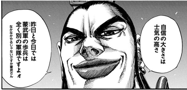 自信の大きさは士気の高さ。 昨日と今日では蒙武軍の歩兵は全く別の軍隊ですよぉ。 キングダム。