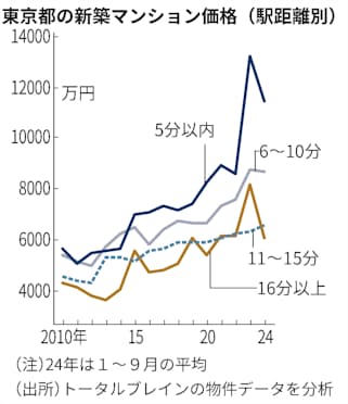都内新築マンション、駅徒歩5分以内は10年で価格2倍に - 日本経済新聞。