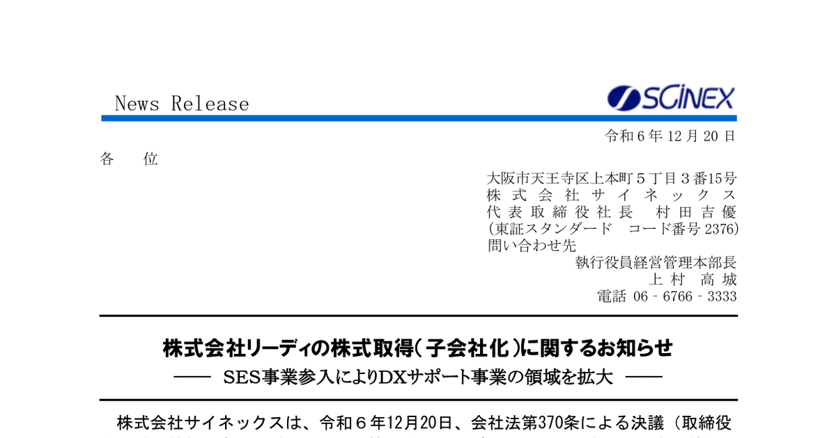 サイネックス 2376 :株式会社リーディの株式取得 子会社化 に関するお知らせ 2024年12月20日 適時開示:日経会社情報DIGITAL:日本経済新聞。