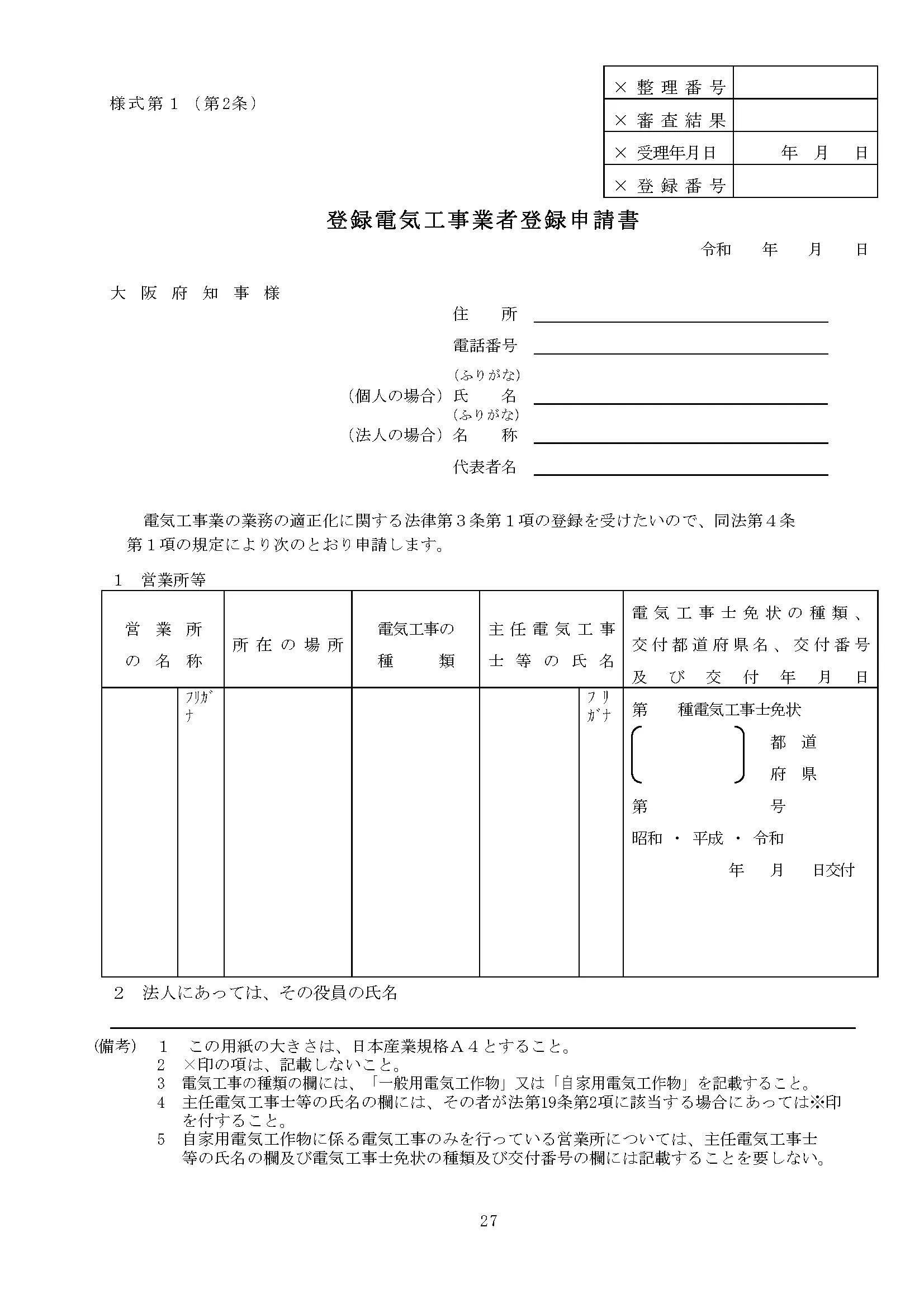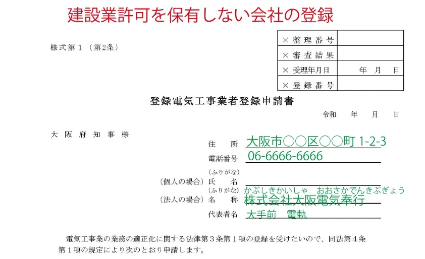 電気工事業者登録申請書の書き方と見本 大阪府知事登録。