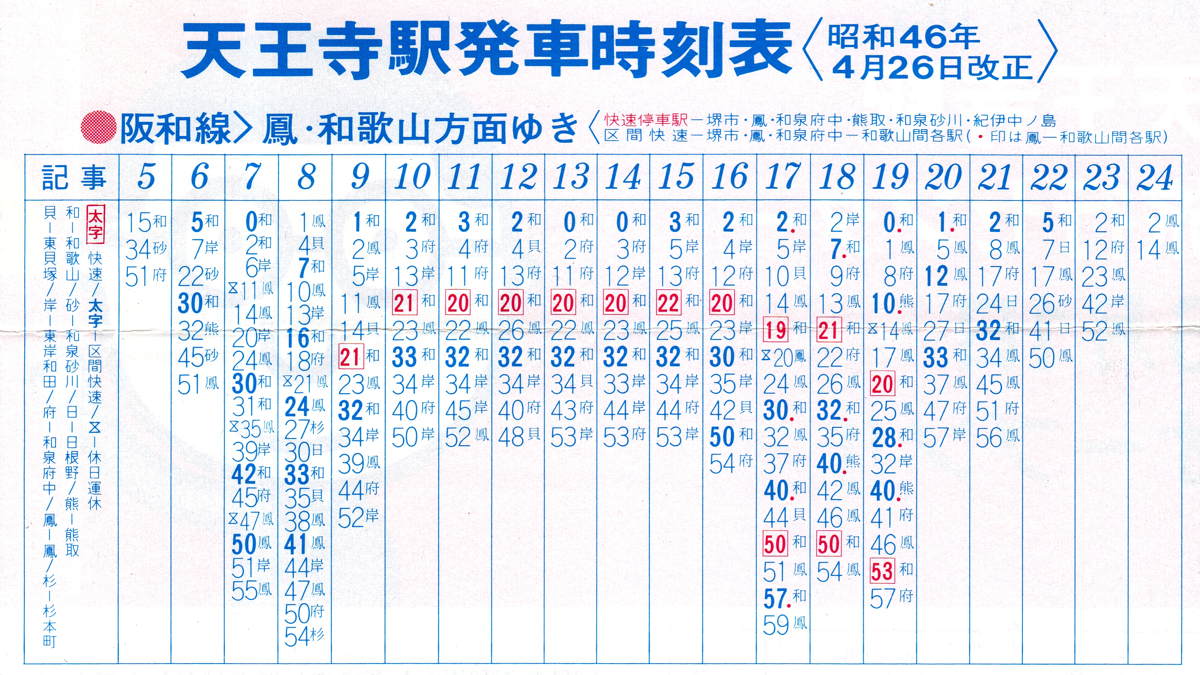 天王寺駅発車時間表 1958年12月改正 提供富士銀行。