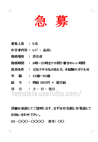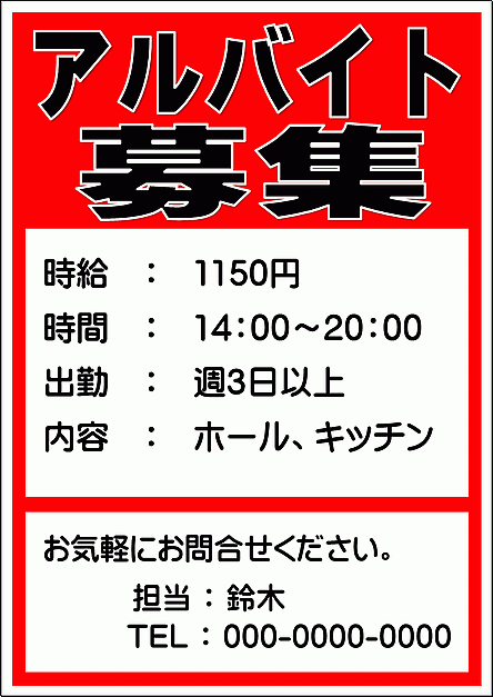 アルバイト募集の張り紙 - Wordで作成した無料テンプレートのダウンロード。