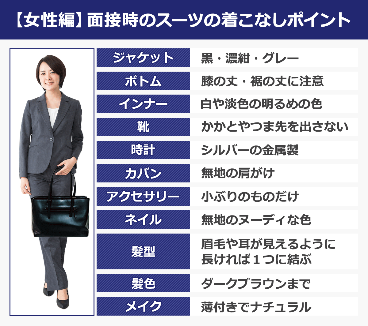 AnyKan:転職ガイド-面接時の身だしなみ徹底解説!-スーツの場合:女性。