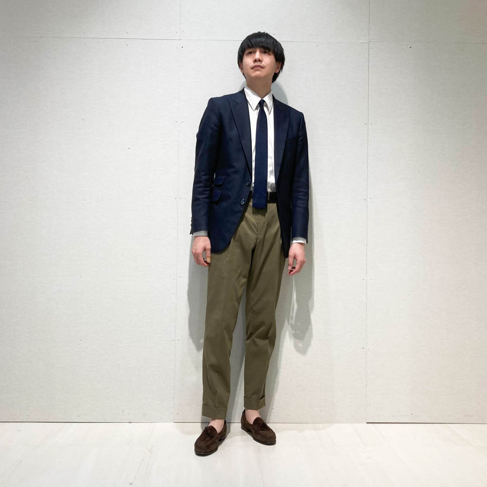 STAFFコーデ カーキのチノパンがポイントの綺麗めジャケパンスタイルオーダースーツのFABRIC TOKYO。