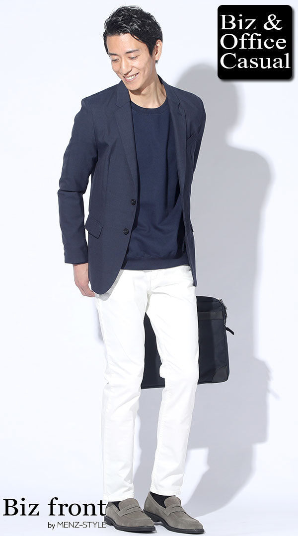 ネイビージャケット×ネイビースウェットトレーナー×白ストレッチチノパン biz21ss_2399のコーディネート例ビジネス ・オフィス・スマートカジュアル専門通販。