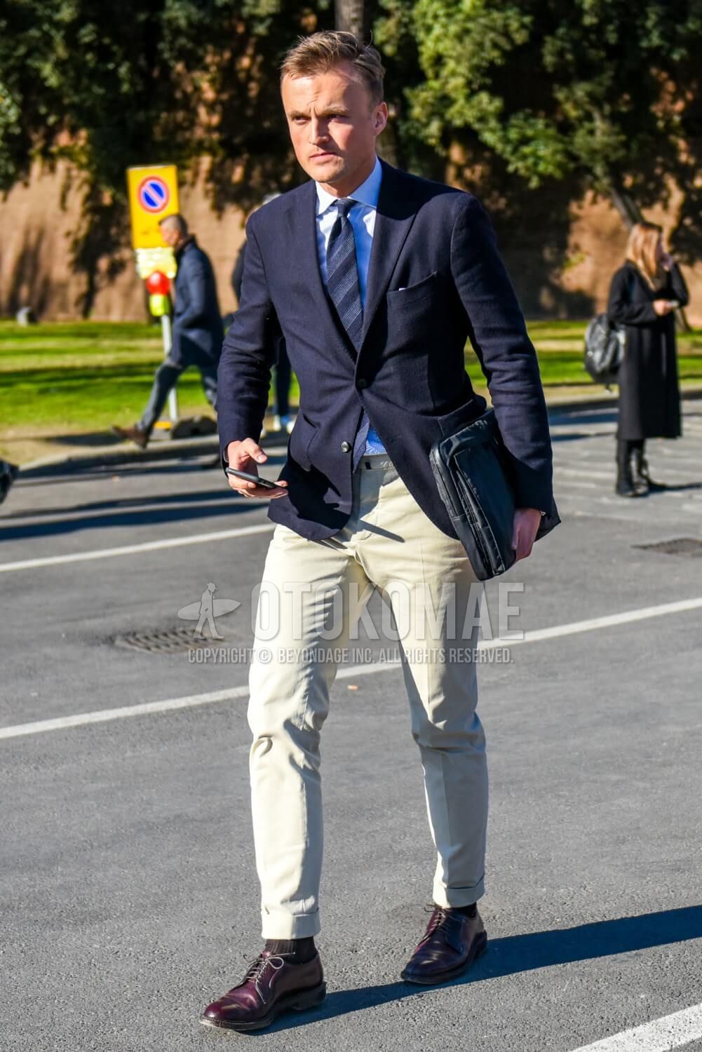 20代 ネイビーテーラードジャケット×白ワイシャツ×ベージュチノパンbiz22aw_5375。