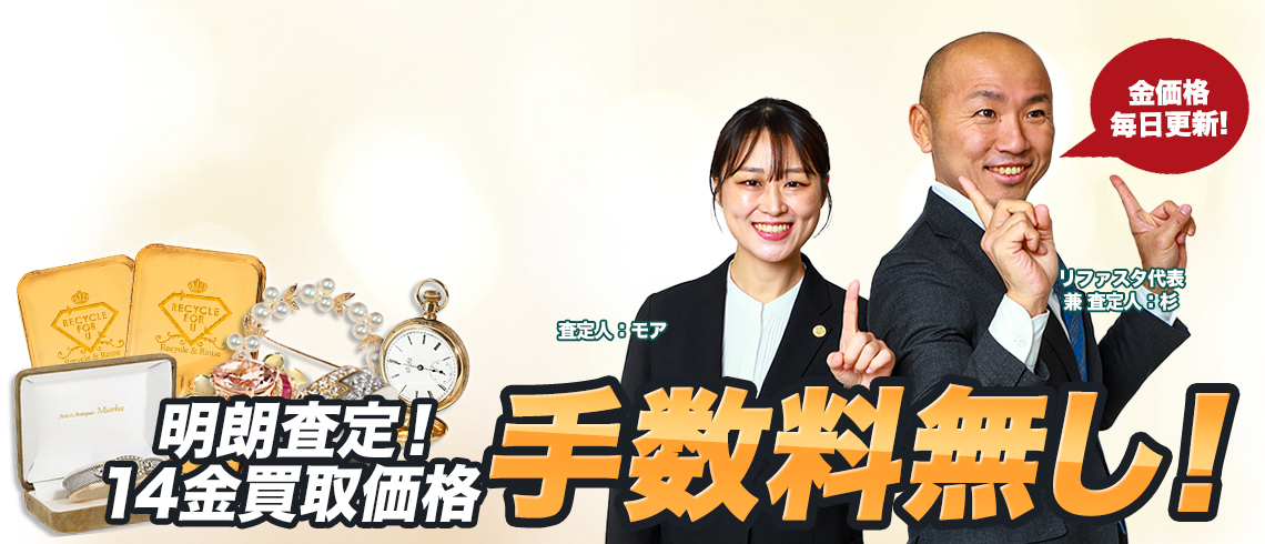 14金 K14,585 の買取, 今日の1gあたりの地金相場金プラチナの高額買取なら実績No.1のリファスタ。