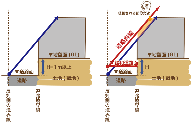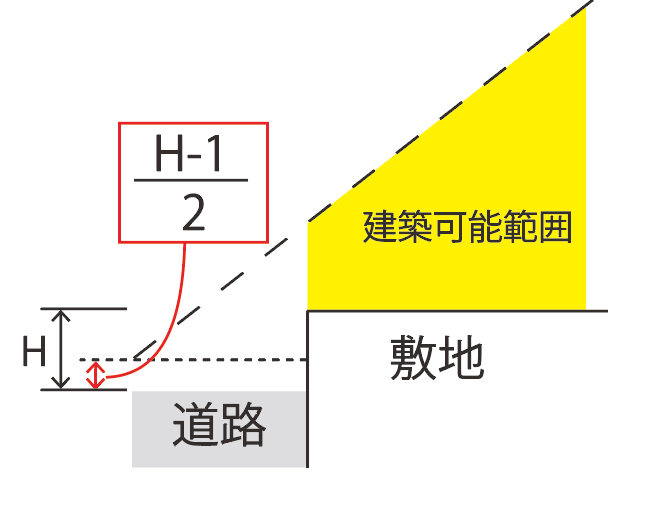 道路斜線 高低差緩和 とは?用途地域や斜線制限についてイラストで説明。