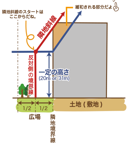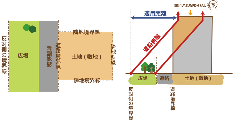 道路斜線 水面緩和 とは?用途地域や斜線制限についてイラストで説明。