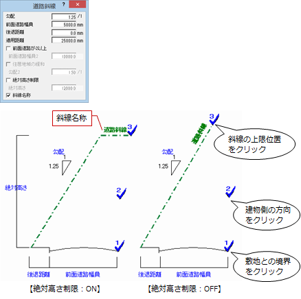 道路斜線 北側斜線 隣地斜線 高度地区 斜線 勾配シンボル立面図。
