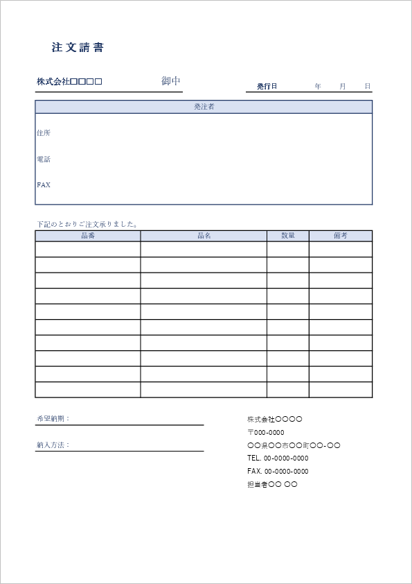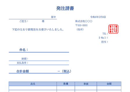 発注請書 注文請書 エクセルテンプレート・サンプル 無料 ・作成・書き方。