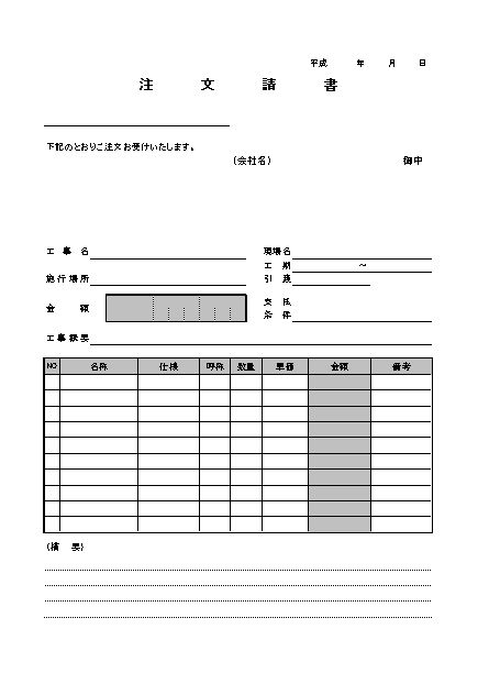 注文請書の書式テンプレート Excel・エクセルテンプレート・フリーBiz。