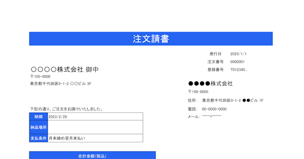 注文請書Excel作成の基本テンプレートを無料ダウンロード。