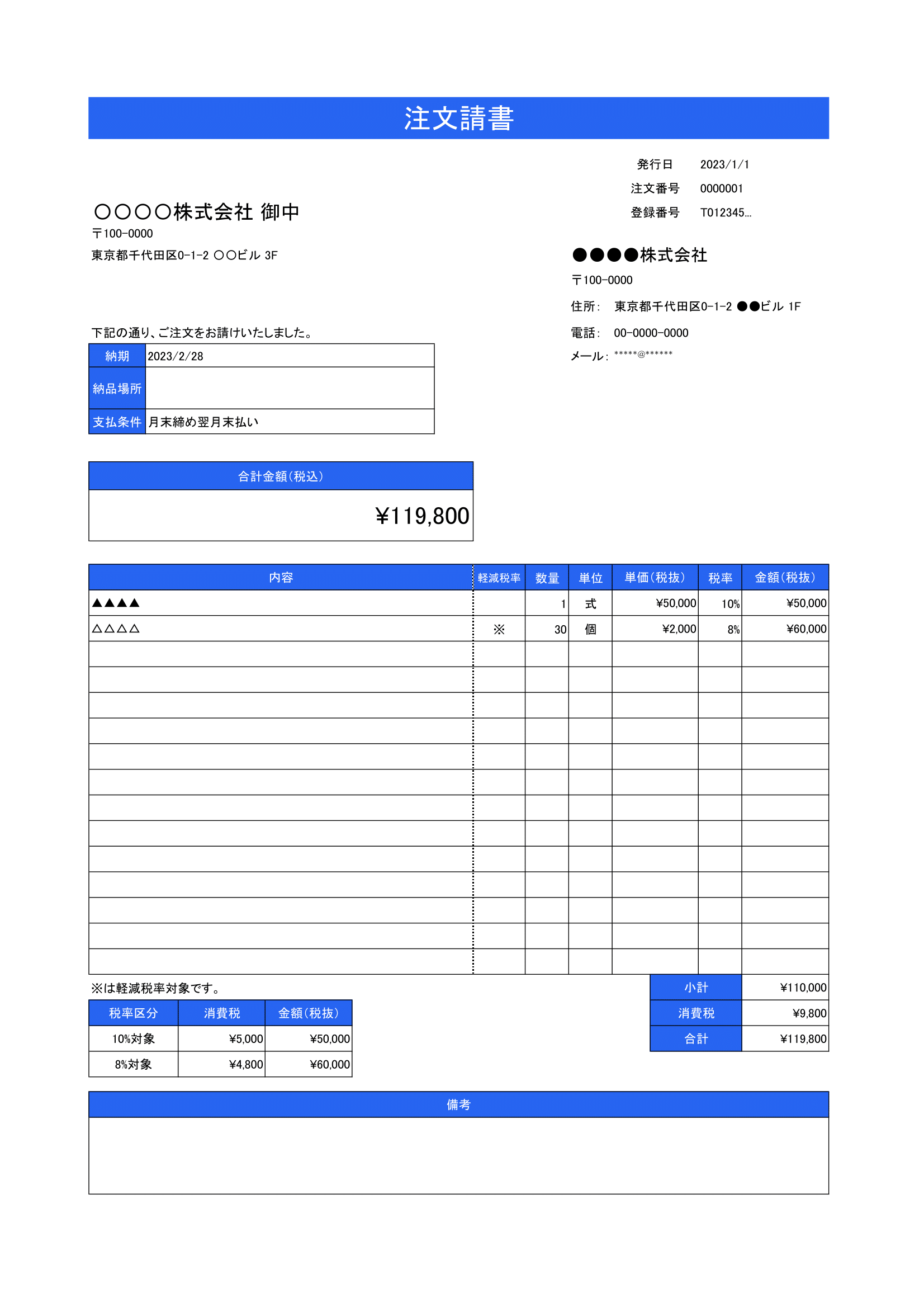 注文請書 インボイス制度対応 の無料Excelテンプレート。