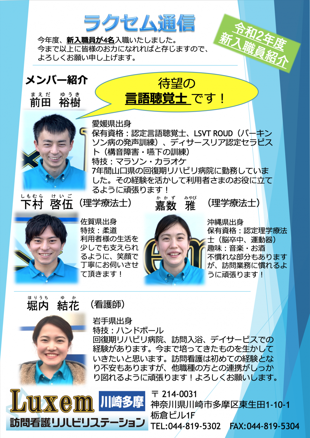 新入職員の紹介です☆株式会社Luxem ラクセム 川崎市多摩区 訪問看護・リハビリ・デイサービス・居宅支援事業。