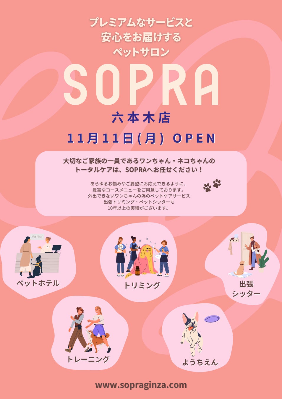 ペットサロン「SOPRA」17店舗目を11月11日に六本木でオープンソプラ銀座株式会社のプレスリリース。