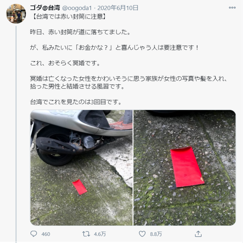 冥婚 めいこん 死者との結婚・台湾「赤い封筒」は何を意味する?拾わないよう言い聞かされて育つ台湾人訪日ラボ。