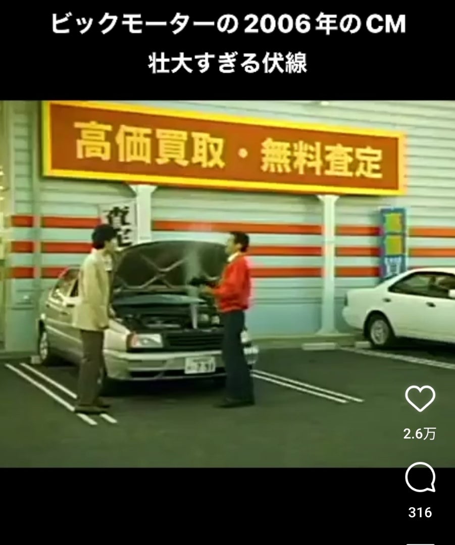 tonegawa on X: "ビッグモーターの不正で思い出したけど、CMで家族でドライブ中にいきなりパパが「車売ろうかな!」って唐突にキチゲ開放スマイルしだして店に直行するやつ狂気的で好きなんだよな。https:t.co 5sLXdW1pyb"X。