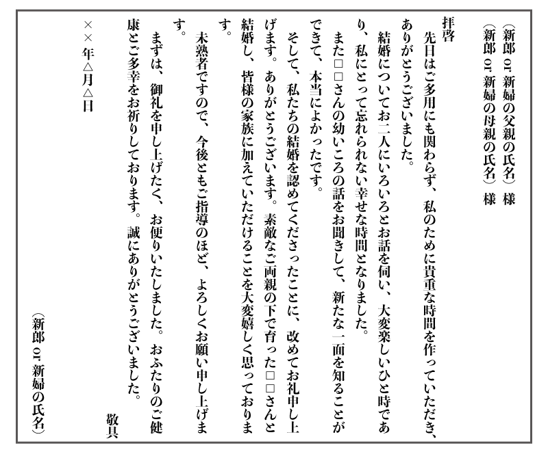 文例付き 親あいさつ後にそのまま使える。お礼状の書き方&出し方ゼクシィ。