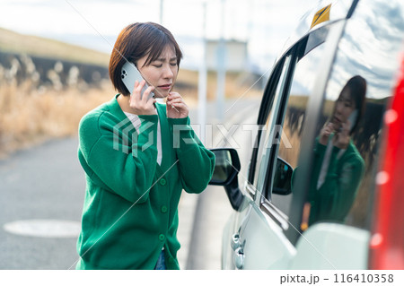 車のトラブルで電話する女性 自動車事故で困る女性の写真素材116410707- PIXTA。